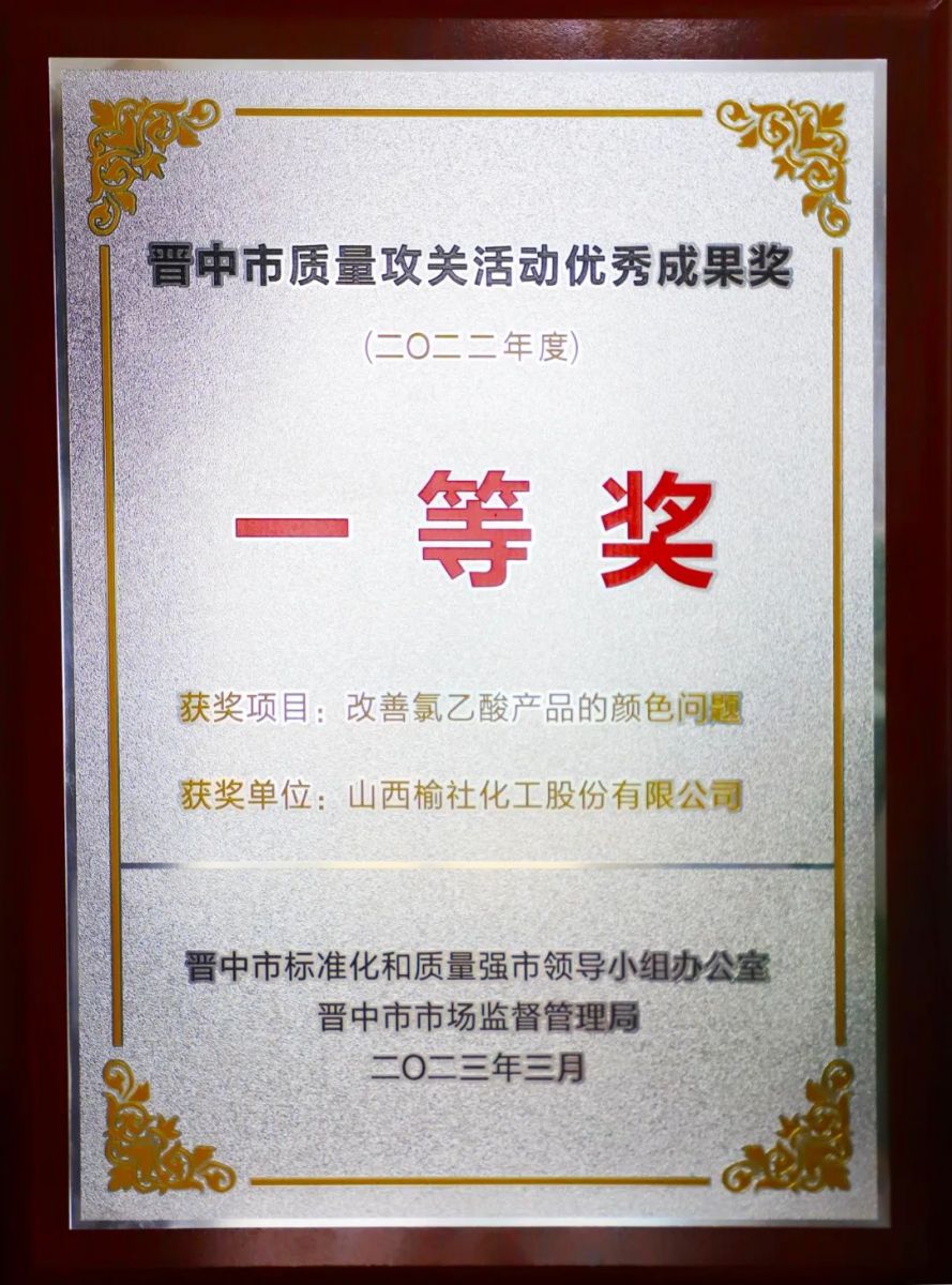 近日,晋中市2022年度质量攻关活动优秀成果名单揭晓,公司“改善氯乙酸产品的颜色问题”质量攻关项目荣获晋中市质量攻关优秀成果奖一等奖优异成绩,公司被授予“质量攻关先进企业”荣誉称号。自2018年开展质量攻关以来,公司申报项目已连续四年斩获一等奖的佳绩,项目的实施取得了显著成效,有力地推动了产品质量的不断提升。
